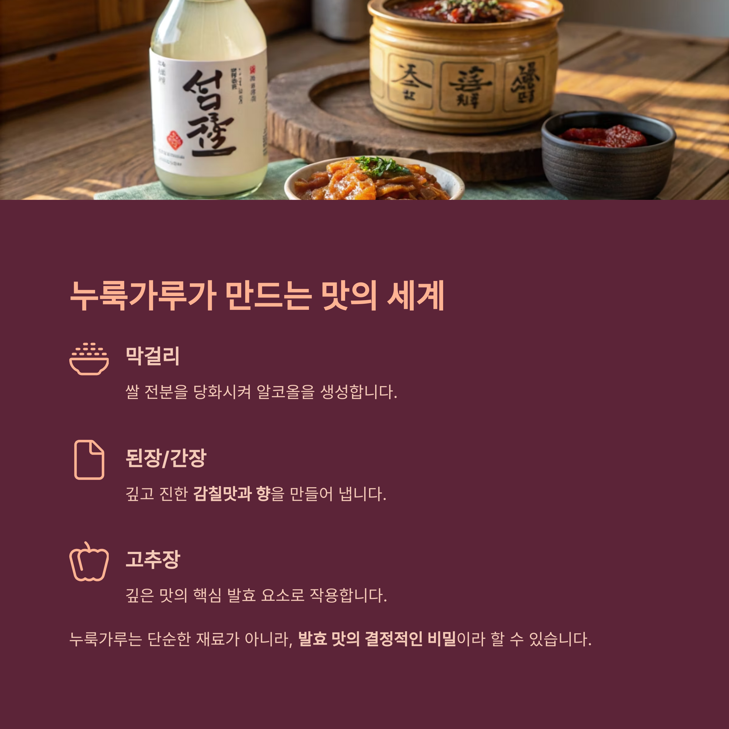 누룩가루는 단순한 재료가 아니라, 발효 맛의 결정적인 비밀이라 할 수 있습니다.