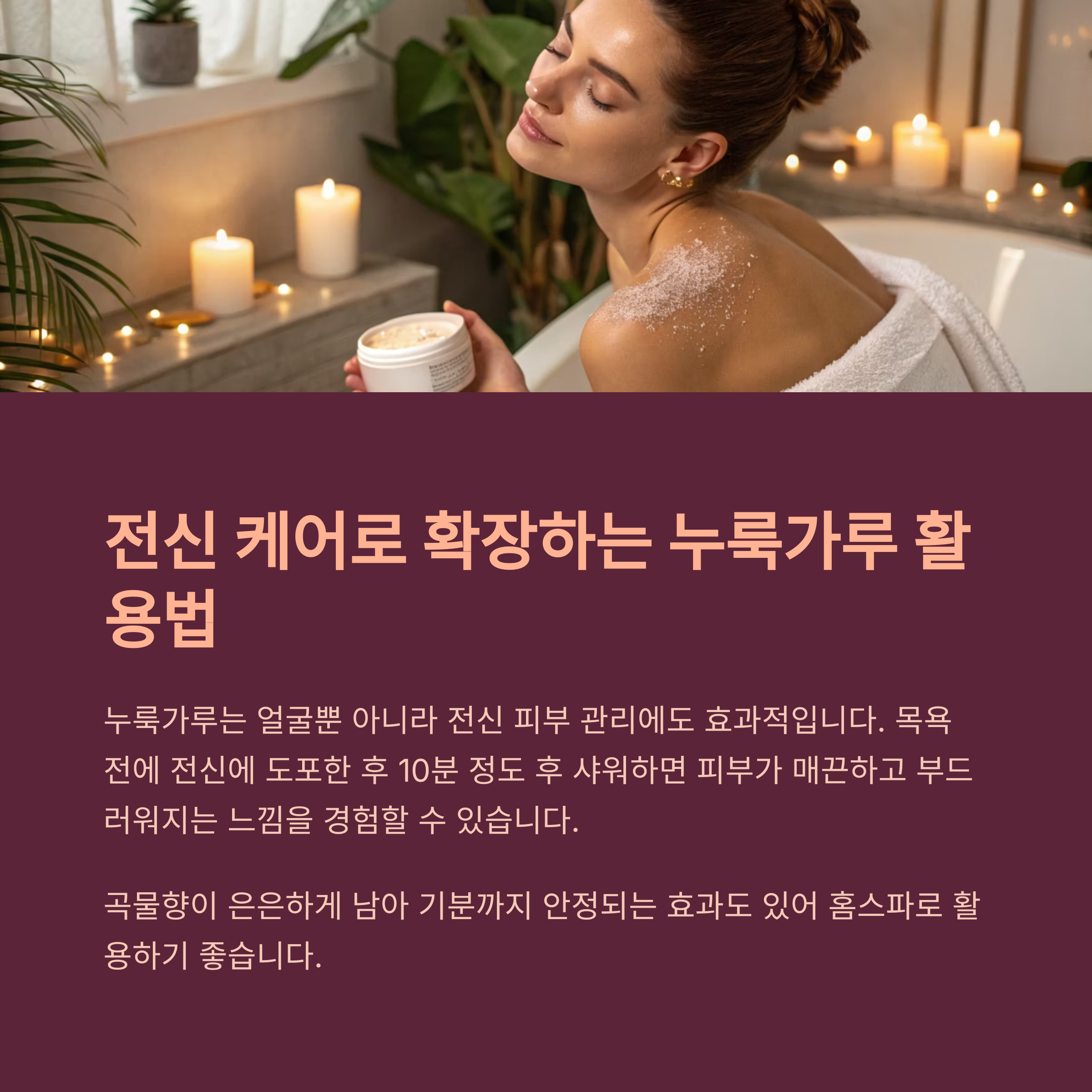 누룩가루는 얼굴뿐 아니라 전신 피부 관리에도 효과적입니다.