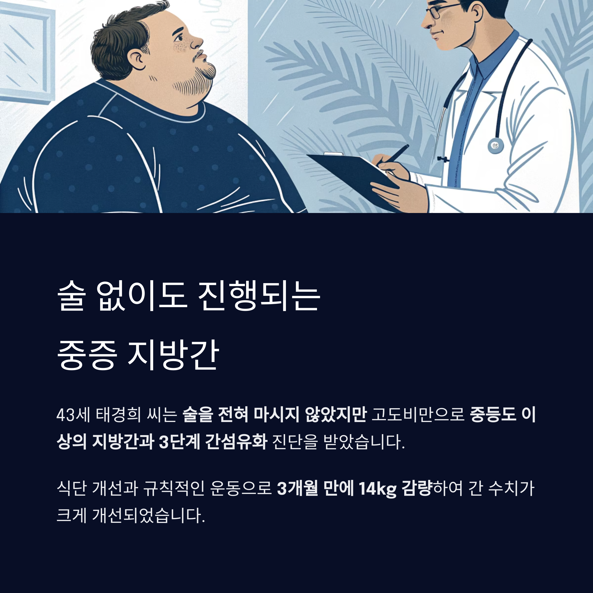 43세 남성 태경희 씨는 건강검진에서 중등도 이상의 지방간과 3단계 간섬유화 진단을 받았습니다.