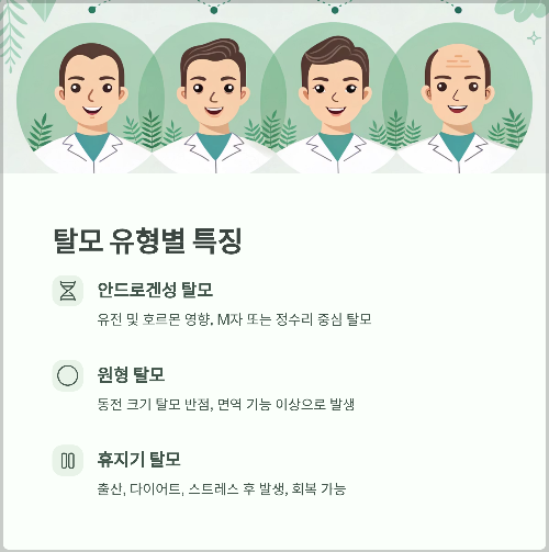 다음은 각 탈모 유형에 대한 구체적인 특징입니다.