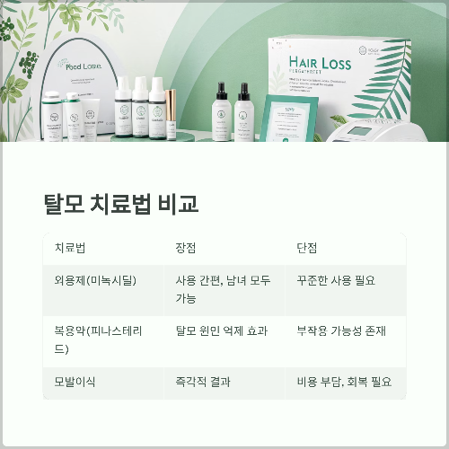 | 외용제 (미녹시딜) | 두피에 바름 | 사용 간편, 남녀 모두 가능 | 꾸준한 사용 필요 |